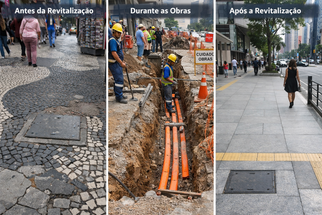 Por isso, quando a prefeitura iniciou o processo de revitalização e padronização das calçadas da Paulista, não se tratava apenas de uma obra estética. Era uma intervenção urbana com impactos diretos na mobilidade, na acessibilidade e também na infraestrutura subterrânea que sustenta boa parte da conectividade da cidade.
